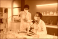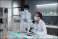 >Naklejka na meble>Two scientists wearing masks are working in a laboratory performing analysis with microscope and beakers on the table, communicating and focusing on scientific research