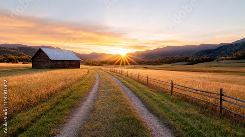 Fototapeta - A serene landscape featuring a rustic barn against a beautiful sunrise backdrop, highlighting the quiet beauty of nature and rural living in the countryside.