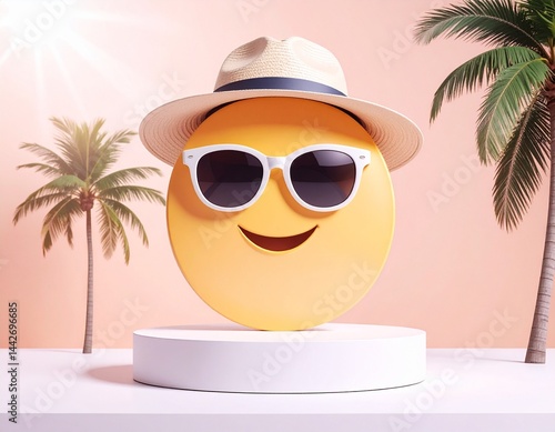 Wakacyjne tło produktowe z podium, plażą, palmami i słońcem w kapeluszu i okularach przeciwsłonecznych