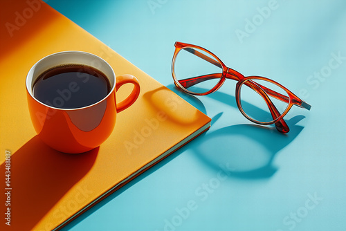 Fototapeta - Żywy płaski układ pomarańczowej filiżanki do kawy i szklanek na jasnoniebieskim tle