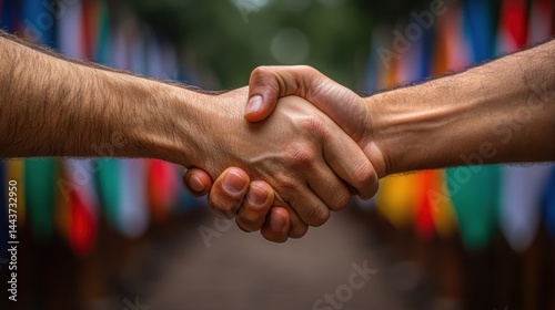 >Naklejka na meble>Close-up of a handshake between two people with visible forearms, set against a backdrop of blurred international flags, symbolizing cross-cultural agreement and cooperation.