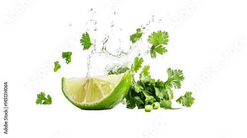 Fresh lime slices and cilantro splashing in water, creating a vibrant culinary scene perfect for food photography