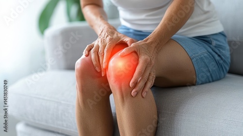 >Naklejka na meble>A woman suffering from knee pain due to an injury, tendon problems from a workout, osteoarthritis, and articular inflammation, with a focus on the discomfort and impact on daily life.