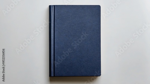 Fototapeta - A closed hardcover book with a solid navy blue cover and visible spine, lying flat on a seamless white background, viewed from directly above. Created Using: flat lay photography, macro lens clarity,