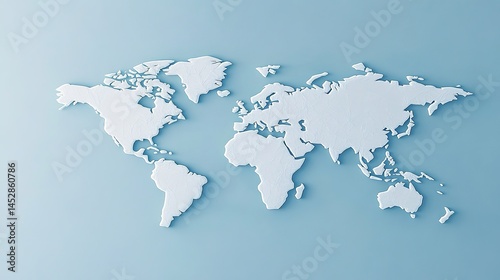 Minimalist 3D-rendered world map with light-colored continents on a soft blue background.