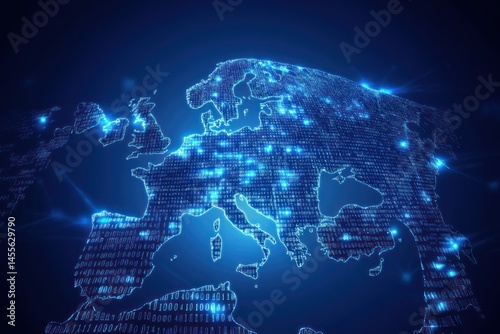digital planet with binary matrix and wireframe lines, global tech concept centered on Europe