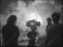 A film crew films a dramatic explosion scene at night using professional cinematic equipment du movie production.