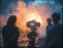 Fototapeta - A film crew films a dramatic explosion scene at night using professional cinematic equipment du movie production.
