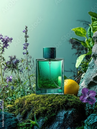 Fototapeta - Perfume bottle amidst greenery and a lemon