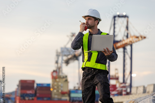 >Naklejka na meble>A male port engineer wearing a safety vest and helmet holds a laptop and talks on a radio at a busy shipping dock, overseeing cargo operations with cranes and containers in the background.