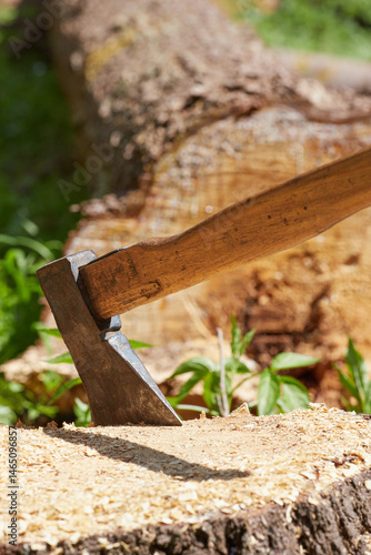 Fototapeta - Siekiera wbita w pień drzewa, wycinka lasu