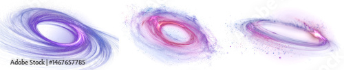 Fototapeta - Three cosmic energy portals with indigo, violet, and magenta particle swirls, spiral vortex effect for sci-fi or space themes, transparent background