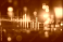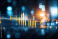 Abstract financial data visualization. Complex chart with orange/yellow data points on a dark background with blurred city lights.