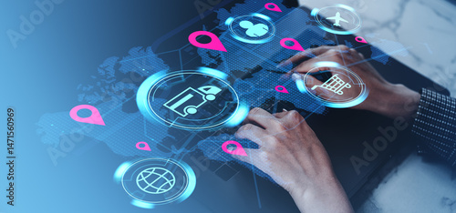 Fototapeta - Logistics and transportation management concept with global tracking interface overlayed.