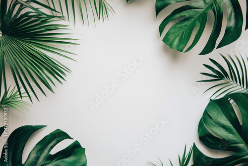 >Naklejka na meble>Tropical green palm and monstera leaves frame on white background with blank space. Fresh botanical trend concept for spa wellness and natural design.