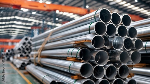 Fototapeta - Stacked steel and aluminum pipes awaiting shipment