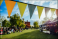 >Naklejka na meble>A lively outdoor festival scene with colorful bunting flags strung across a sunlit park, where people gather and enjoy a communal celebration under clear skies