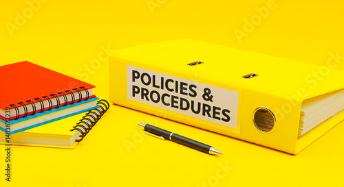A yellow binder labeled policies and procedures with notebooks and pen on yellow background is visible