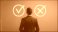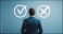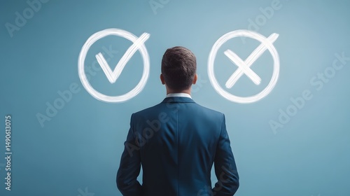Fototapeta - Businessman contemplating options and making a decision between right and wrong choices during a difficult business crisis symbolized by true and false logic