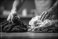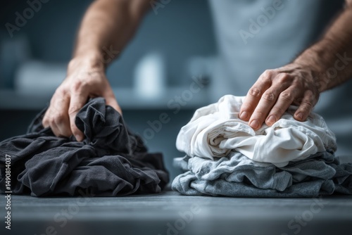 Fototapeta - A man folding clean laundry on a table, separating dark and light clothes with care and attention to detail, making the task more efficient and organized.