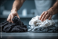 >Naklejka na meble>A man folding clean laundry on a table, separating dark and light clothes with care and attention to detail, making the task more efficient and organized.