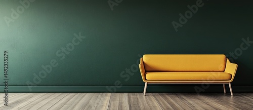 Fototapeta - Yellow sofa against green wall, wood floor, interior design