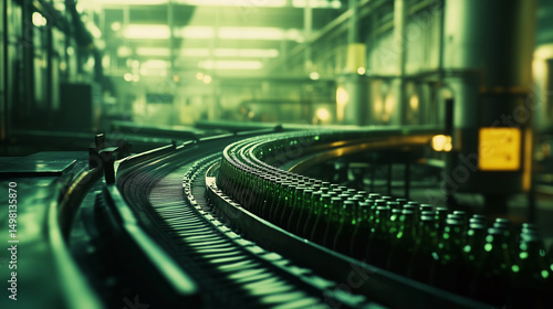 Fototapeta - Nowoczesna linia produkcyjna w fabryce. Zielone butelki przechodzą przez proces napełniania i pakowania, gotowe do dystrybucji.
