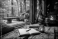Fototapeta - A cozy autumn scene inside a wooden cabin with a notebook, candle, and fireplace, offering a peaceful retreat and escape into nature with warm lights.