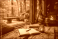 >Naklejka na meble>A cozy autumn scene inside a wooden cabin with a notebook, candle, and fireplace, offering a peaceful retreat and escape into nature with warm lights.