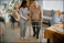 Fototapeta - Nurse in uniform assisting senior man with walker inside cozy nursing home while another resident in background engages in activities