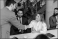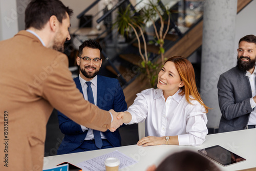 Fototapeta - An executive standing at boardroom and congratulating businesswoman on a success in front of team of experts.