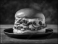 ultra detailed smash burger, double beef patties, melted cheddar cheese, glossy brioche bun, pickles, dripping burger sauce, placed on matte black plate, on a neutral stone background, bold hard light