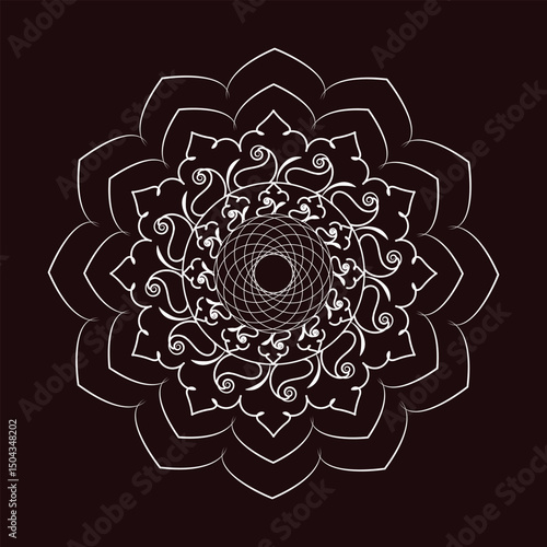 Fototapeta - Elegant White Mandala with Geometric Center on Dark Maroon Background, Artistic Design