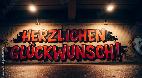 Fototapeta - HERZLICHEN GLÜCKWUNSCH: Congratulatory Graffiti Art on Concrete Wall at Night