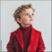 Urocze dziecko z kręconymi blond włosami, ubrane w stylowy czerwony płaszcz i golf, patrzy z zaciekawieniem w górę.