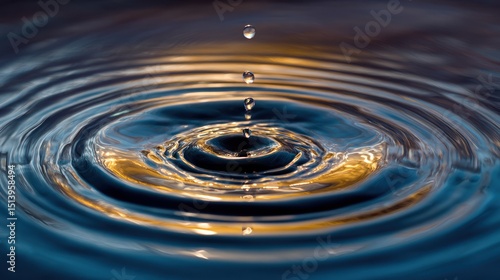 Fototapeta - Water drop creates ripples in a blue liquid surface with golden reflections.