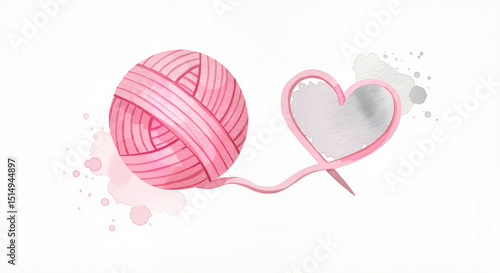 Fototapeta - Pink yarn ball with thread shaping a heart on soft background