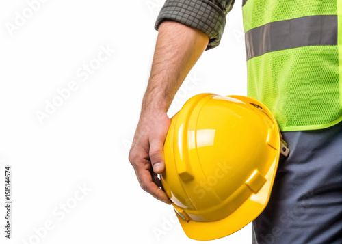 Fototapeta - Construction worker’s hand holding safety helmet strap isolated on a transparent background.