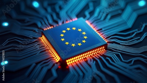A European-made computer chip with the EU flag, ensuring independence from non-EU microprocessor production - ai generated