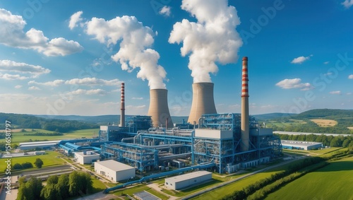 Fototapeta - Industrial power plant with cooling towers emitting steam in a rural landscape under a clear blue sky