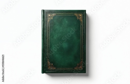 >Naklejka na meble>Green book cover isolated on white. Top view, close-up. Vintage design with gold patterns. Blank space for text. Perfect for education, knowledge, reading, literature, study or history.
