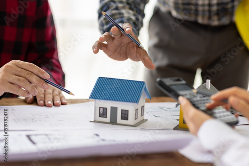 Fototapeta - Architects and engineers are having a meeting in their office. They are working on a construction project and using a calculator to calculations. Building construction design and plan project budget.