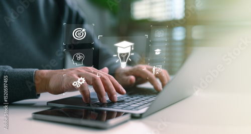 Fototapeta - Online education and digital learning concept. Hands typing on a laptop with education icons such as diploma, brain, and target, ideal for e-learning platforms, digital skill development.