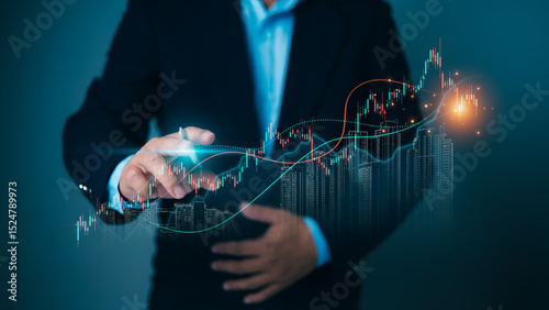 Fototapeta - Business person analyzing financial graphs, symbolizing market growth, investment strategies, and economic development. Concepts of stock trends, Corporate finance, future planning, and data analytics