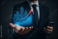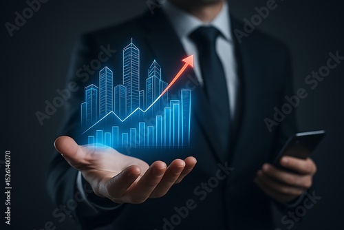 Businessman holding growth chart and city skyline hologram showing business development and investment