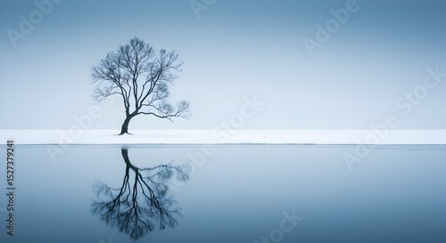Fototapeta - Leafless tree with reflection on a still icy lake under moody blue lighting symbolizing silence and introspective solitude