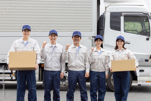 Fototapeta - トラックの前に並ぶデリバリースタッフのグループ