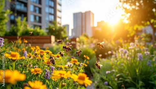 Fototapeta - Urban garden buzzing with activity as bees pollinate flowers amidst the city , the growing trend of beekeeping in urban environments