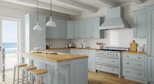 Fototapeta - A modern farmhouse kitchen with light blue cabinets and a wooden island
