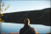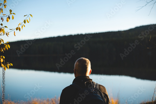 >Naklejka na meble>50 years old backpacker watch lake in Oslo Marka, where calm reflections and golden light embrace the silence of Scandinavian wilderness during sunset